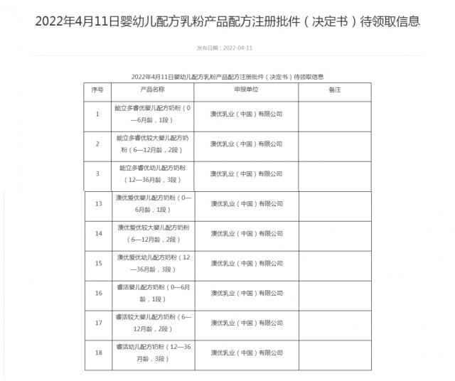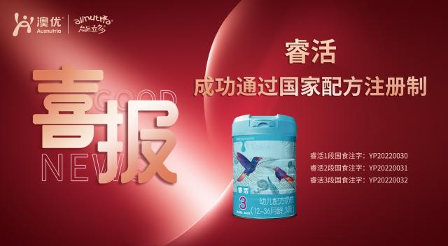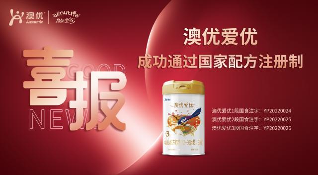4月11日,國家市場監管總局發布的最新一批“嬰幼兒配方乳粉產品配方注冊批件(決定書)待領取信息”,澳優能立多旗下的澳優愛優嬰兒配方奶粉1段、澳優愛優較大嬰兒配方奶粉2段、澳優愛優幼兒配方奶粉3段、能立多睿優嬰兒配方奶粉1段、能立多睿優較大嬰兒配方奶粉2段、能立多睿優幼兒配方奶粉3段、睿活嬰兒配方奶粉1段、睿活較大嬰兒配方奶粉2段、睿活幼兒配方奶粉3段的9個配方獲得通過。